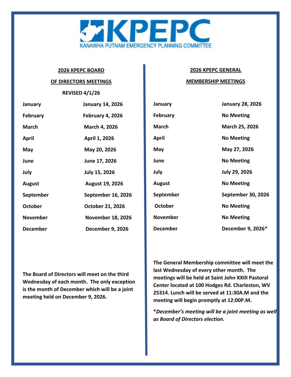 Members must attend a minimum of half of the General Membership meetings during the year to establish voting privileges at the annual Board of Direction election in December. The general membership of the Kanawha Putnam Emergency Planning Committee meets bimonthly according to the schedule listed below. The meetings are at: